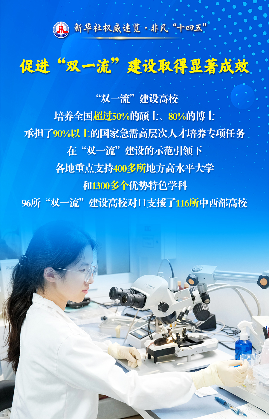 国新办23日举行“高质量完成‘十四五’规划”新闻发布会,教育部介绍“双一流”建设、学生身心健康全面发展、发展职业教育等加快建设教育强国进展成效。据介绍,“十四五”时期,规划所确立的各项目标任务已全面高质量完成。跟随海报,一起了解。