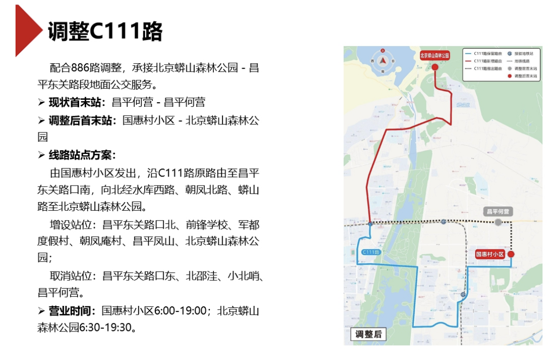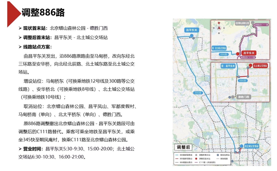 同时,结合线路实际客流需求,885路、886路进一步强化早晚高峰通勤服务功能,取消午间客流较低时段运营。低峰时段,乘客可乘坐345快由昌平城区往返中心城区。此外,配合886路调整,拟同步调整C111路,承接北京蟒山森林公园-昌平东关路段地面公交服务。