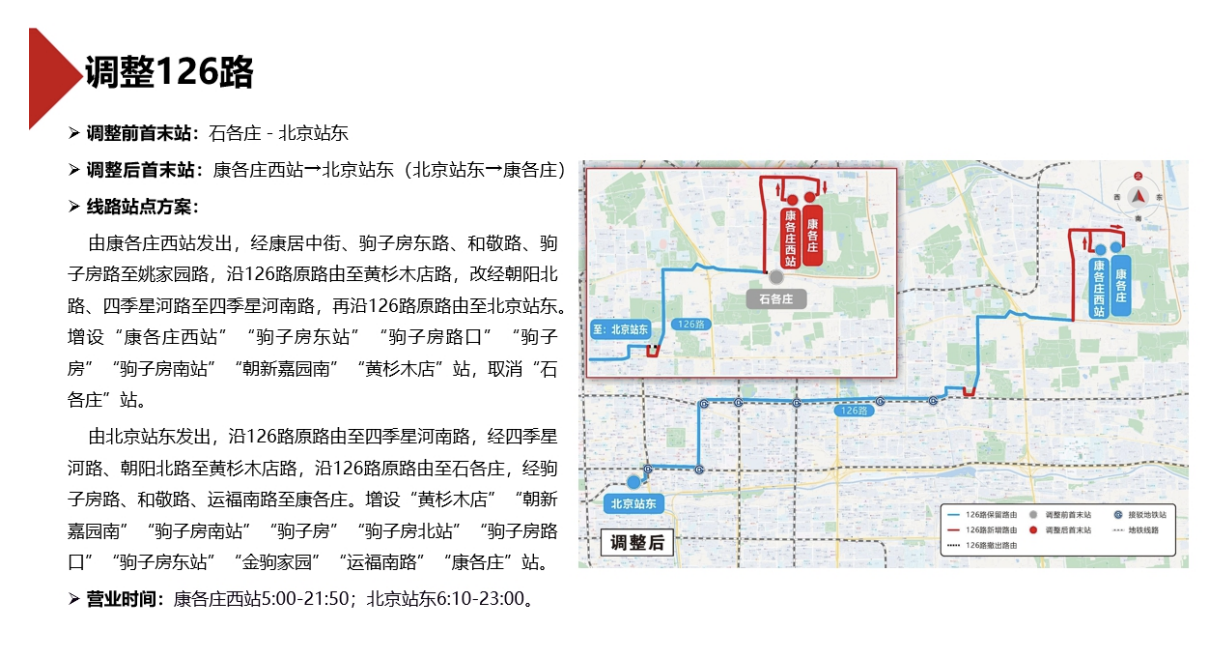 根据方案,本市拟调整126路,线路由石各庄调至康各庄西站,增加驹子房路南段地面公交线网覆盖,进一步方便金泽家园、朝新嘉园等小区乘客出行。同时结合前期富华家园乘客诉求,微调线路中途走向,并增设“黄杉木店”站。