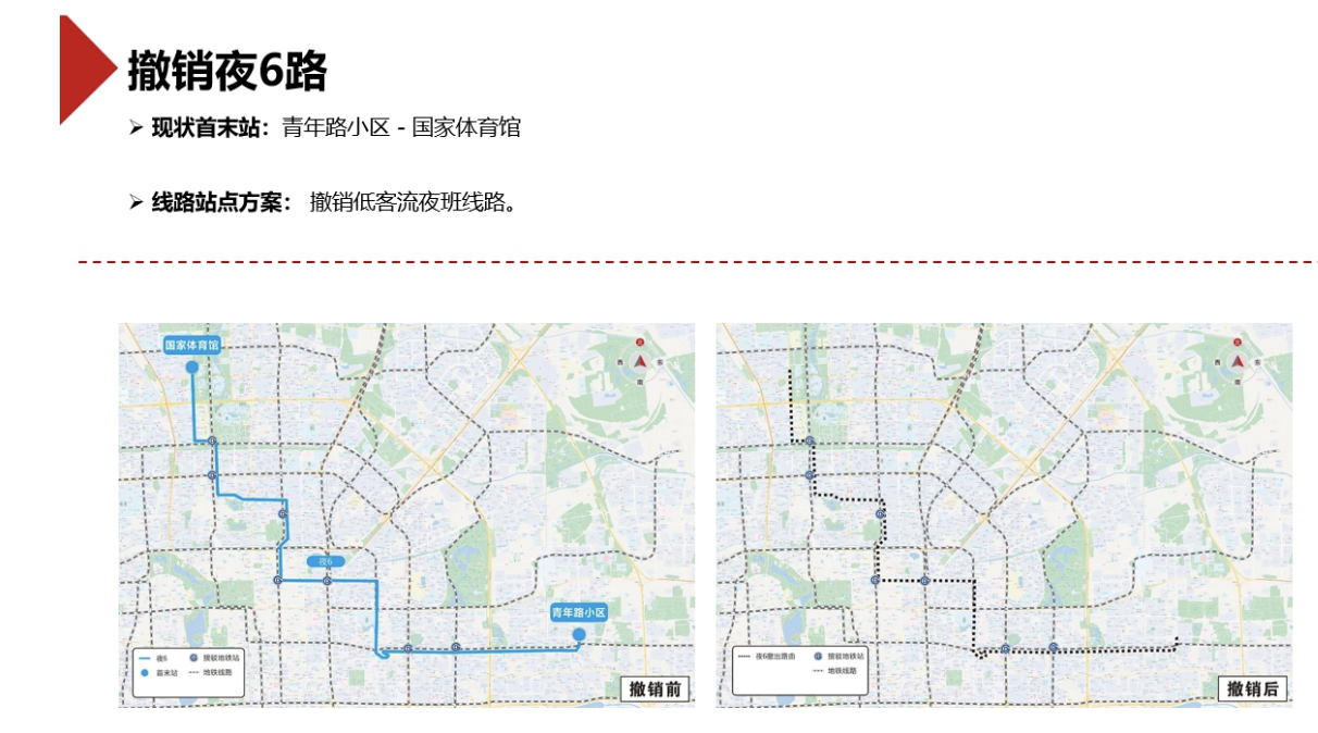 此次方案还计划撤销夜6路(青年路小区-国家体育馆)。根据方案编制说明,该线路客流较低,平均每车次不足4人次。