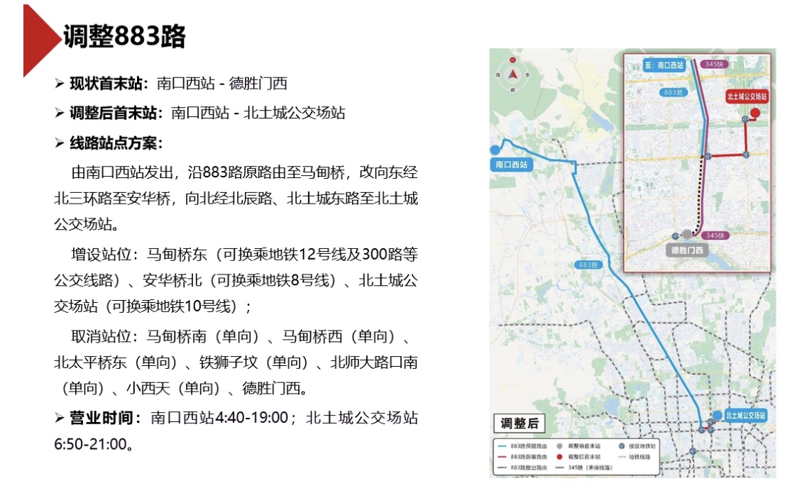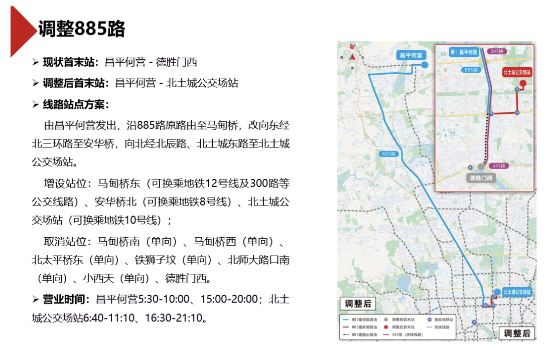 根据方案,拟对883路、885路、886路三条8字头线路进行调整。线路由德胜门西调至北土城公交场站,强化昌平区市郊干线与三环路、市区地铁网的快速接驳,缓解德胜门外大街、北二环辅路交通压力。