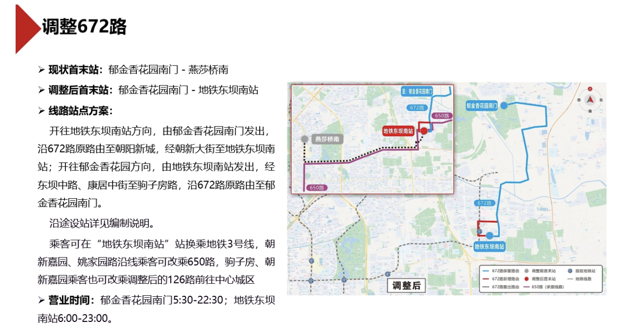 此外,拟调整672路,结合地铁3号线开通后线路客流变化,削减姚家园路与地铁3号线并行路段。乘客可在“地铁东坝南站”站换乘地铁3号线,朝新嘉园、姚家园路沿线乘客可改乘650路,驹子房、朝新嘉园乘客也可改乘调整后的126路前往中心城区。