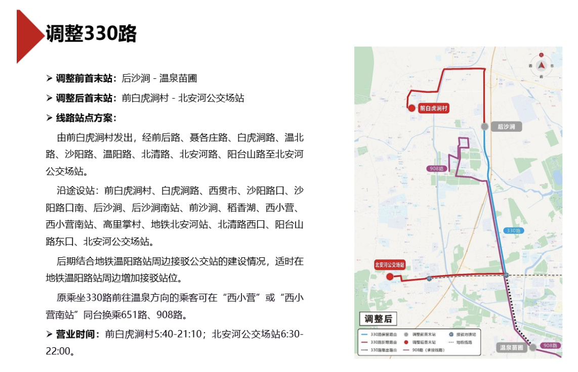 拟调整330路,线路北段由后沙涧调至前白虎涧村,方便前白虎涧村乘客出行,可接驳地铁16号线。线路南段由温泉苗圃调至北安河公交场站,削减温阳路地面公交重复和低客流路段,配合前期544路撤销方案(已公示征求意见),弥补北清路西段及阳台山路地面公交服务。