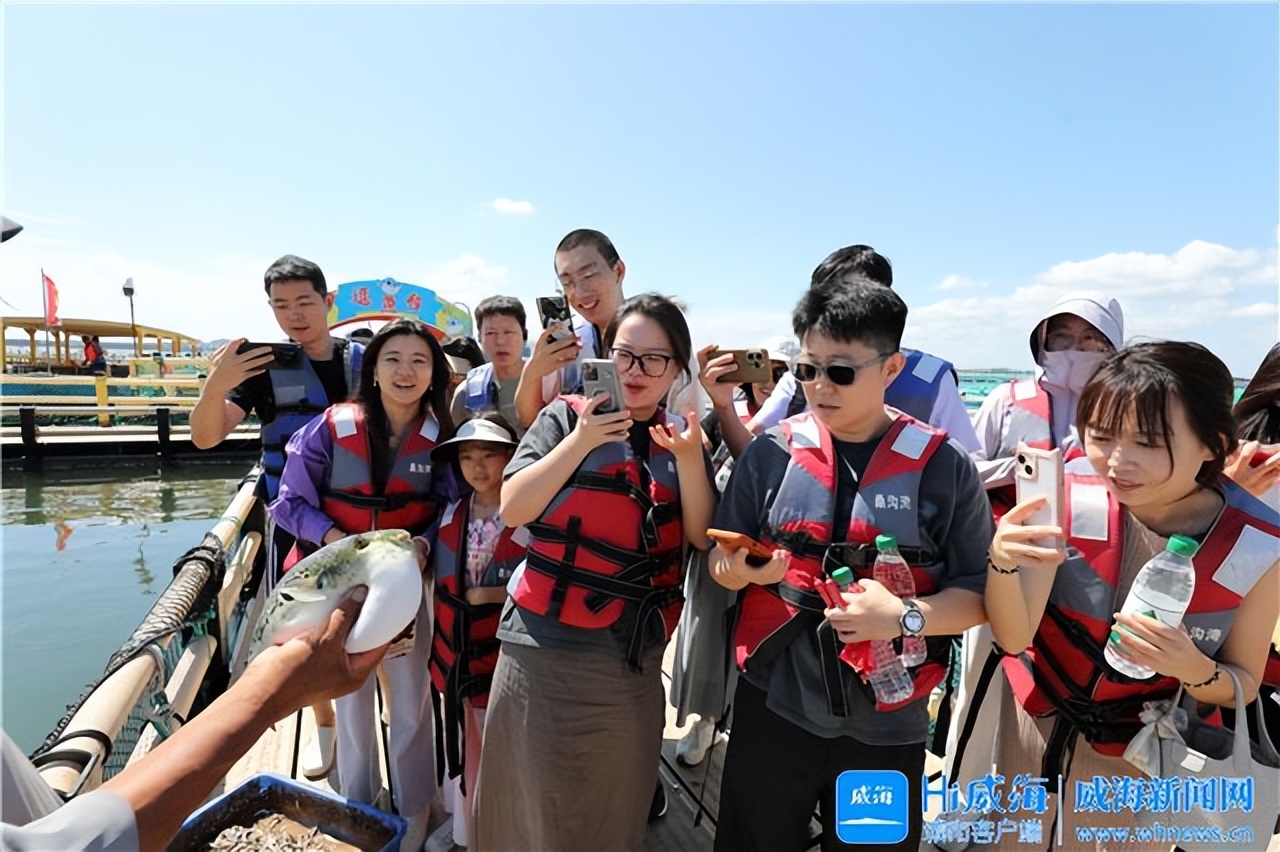 采风团成员深度体验了逗河豚、钓鱼、现捞海鲜等互动项目,亲身感受桑沟湾将传统渔业与现代旅游创新融合的活力。