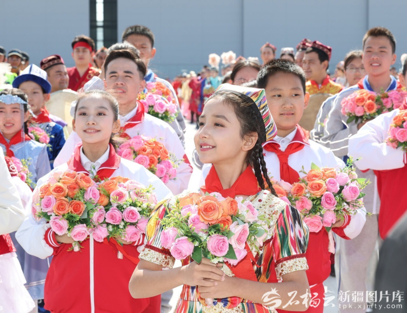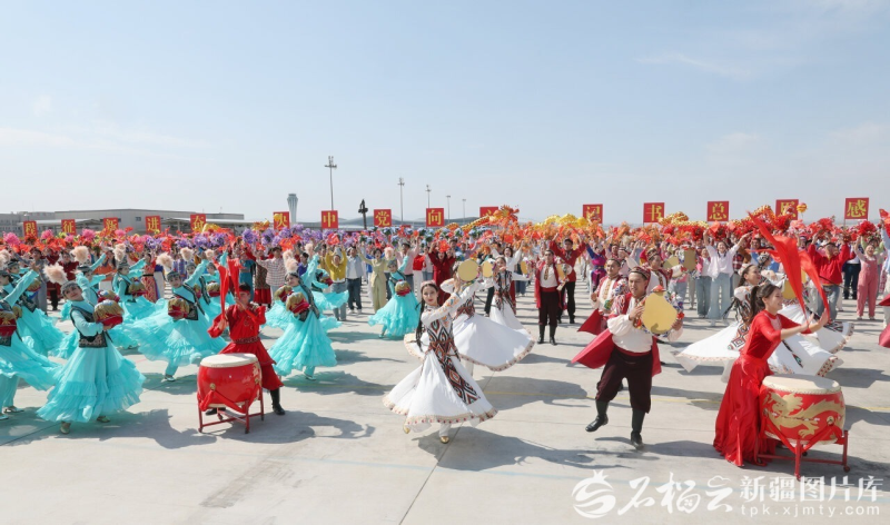 中共中央总书记、国家主席、中央军委主席习近平率中央代表团9月23日下午乘专机抵达乌鲁木齐,出席新疆维吾尔自治区成立70周年庆祝活动。自治区各族群众代表身着节日盛装,挥动红旗和五彩花束,跳起欢快的民族舞蹈,欢迎总书记的到来,表达对总书记的衷心祝福。