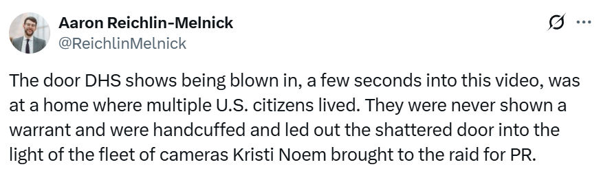 智库机构美国移民委员会的高级研究员阿伦·赖希林-梅尔尼克发帖称,“视频开头几秒,美国国土安全部展示的那扇被炸开的门,属于一处有多名美国公民居住的住宅。他们从未看到搜查令,却被铐上手铐,从破碎的门口被带到一排摄像机前。国土安全部部长克丽丝蒂·诺姆为了宣传专门把这些摄像机带到突袭现场。” ↓