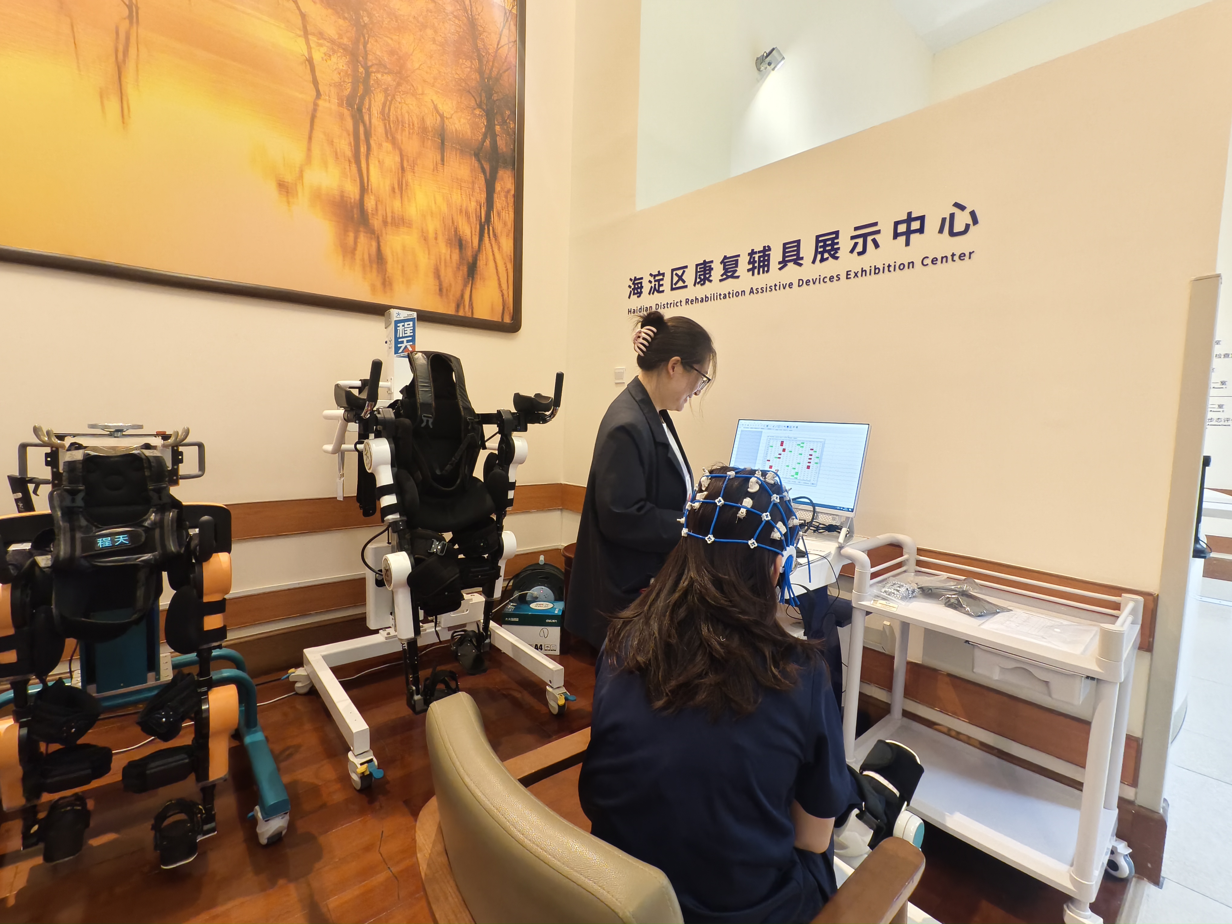 在智能化辅具展示区,记者看到了足膝形态观察仪、肢体与脊柱侧弯智能评测仪、外骨骼步行训练器、脑电监护分析仪等一系列设备。这些AI赋能的技术,正帮助人们更高效地进行康复训练。
