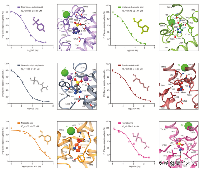 此外,研究团队还解析了6种TauT抑制剂(哌啶甲酸、咪唑-4-乙酸、哌啶-4-磺酸、胍基乙基磺酸、5-氨基戊酸和高牛磺酸)的作用机制,发现它们通过两种策略阻断牛磺酸转运(图2)。这些发现揭示了TauT抑制剂的分子作用模式,为设计高选择性TauT抑制剂提供了结构基础,尤其对癌症等相关疾病的药物研发具有重要参考价值。