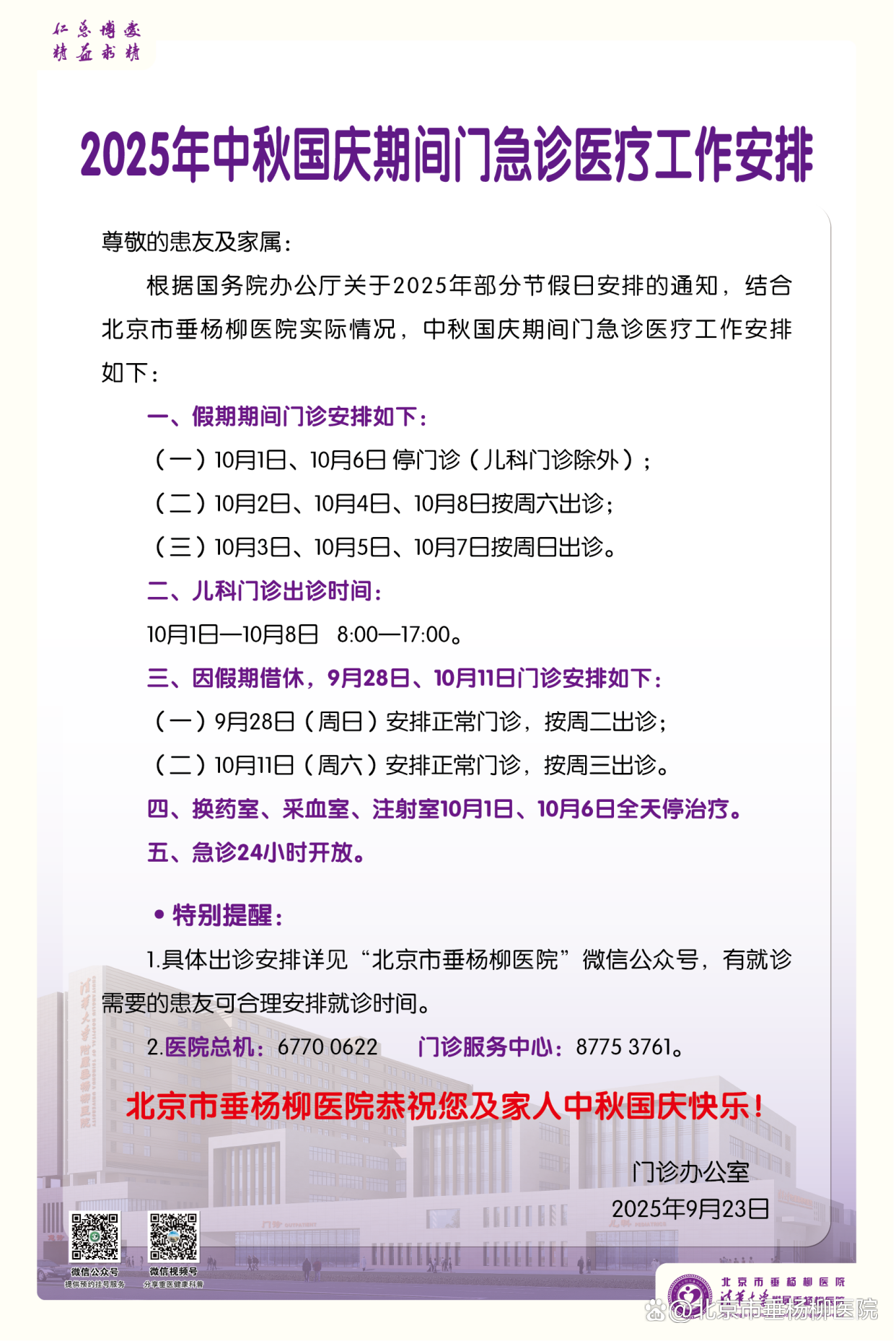 北京市垂杨柳医院2025年中秋国庆期间门急诊医疗工作安排
