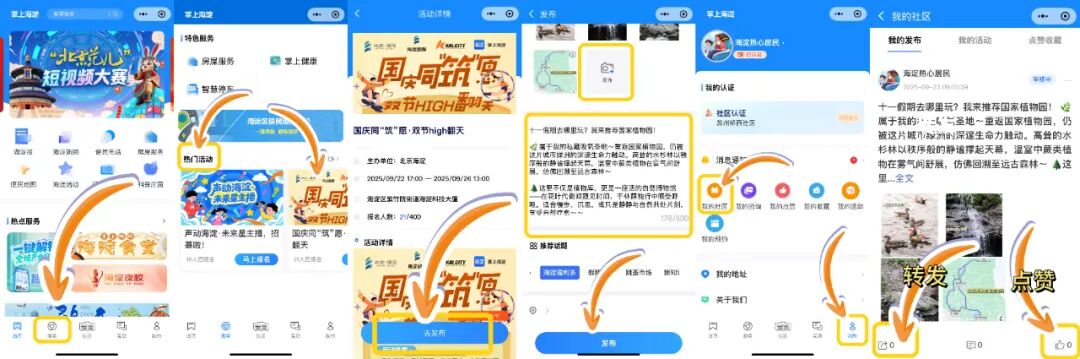 上传作品:微信搜索“掌上海淀”小程序或点击下方链接→进入【服务】页→【热门活动】→点击【马上报名】——发布话题作品。