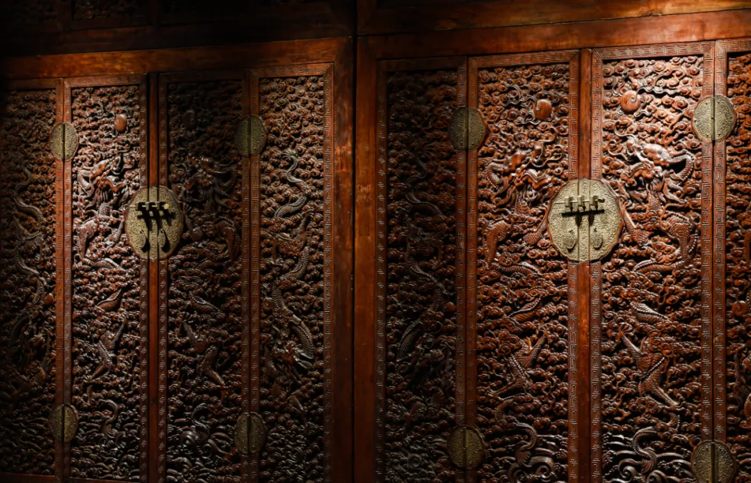 步入正门,仿佛闯入清代造办处的匠作工坊。镇馆之宝——清金丝楠木雕云龙纹顶箱柜静静伫立在此处。这件国家一级文物以整块金丝楠木雕琢,龙纹鳞片纤毫毕现,暗合清代皇室礼制,堪称“木中黄金”的巅峰之作。