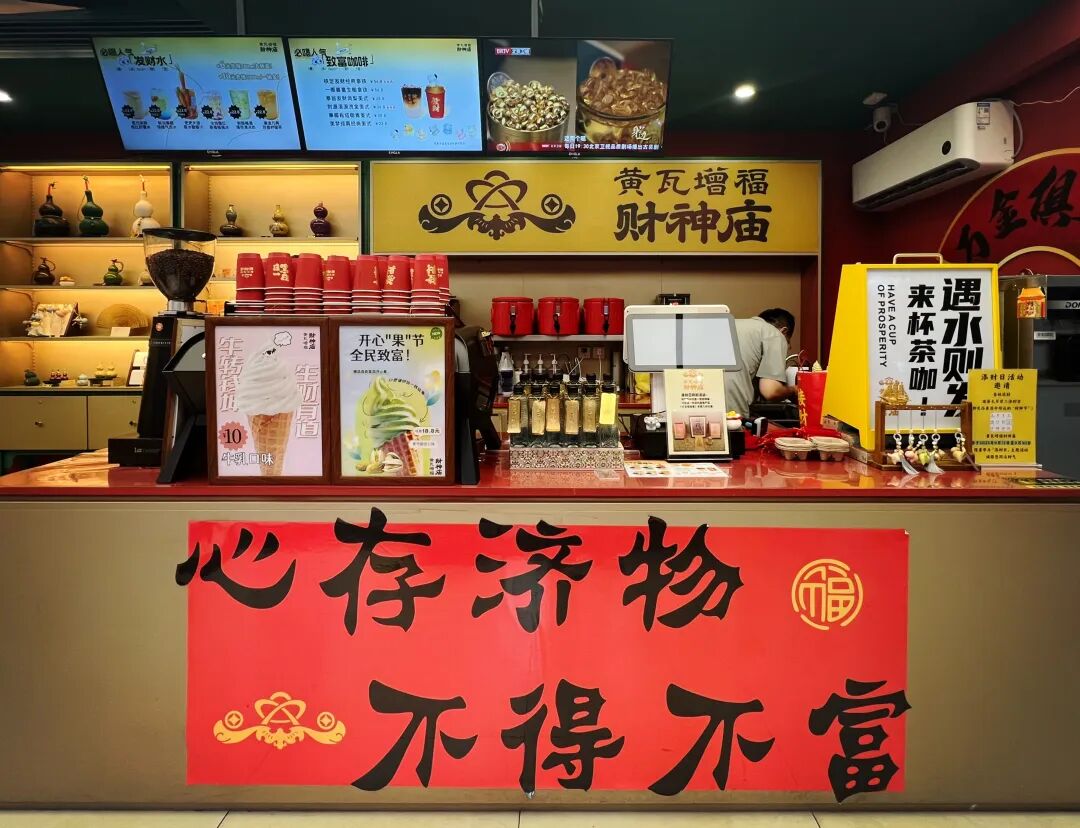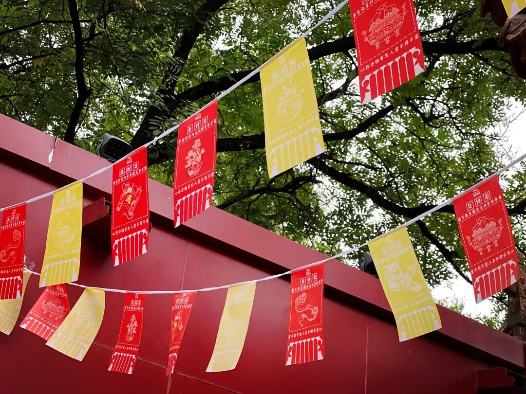 步入庙内,祈福的游客络绎不绝。红墙的布告栏上,图文并茂地讲述着财文化里的顶流当担和财神庙保姆级攻略,更有互动装置,超适合打卡出片!