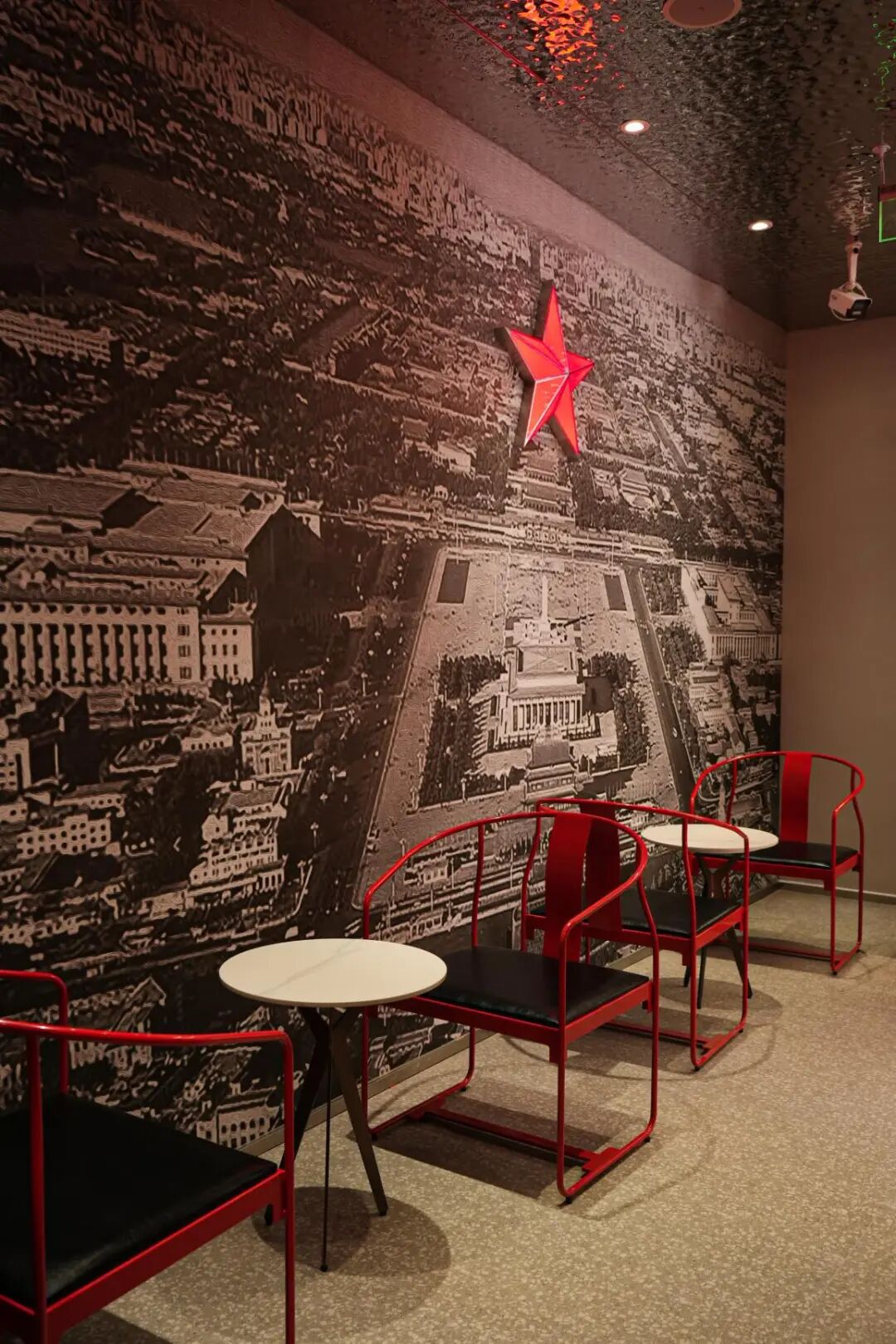 当咖啡遇见“红色文化”,人民咖啡馆便应运而生。进入这年代感满满的咖啡厅,感觉一秒穿越到了上世纪五六十年代的老北京。店铺中,一幅巨大的黑白色调天安门广场俯视图映入眼帘,一颗红星点缀其上,熠熠生辉。