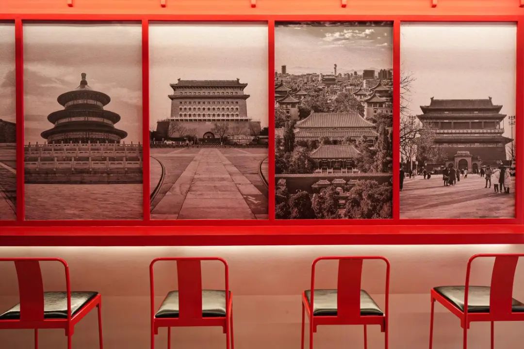 咖啡馆右侧的堂食区域,铺陈着前门、天坛、永定门等中轴线上古建筑的老照片,还有一整面杯子墙,杯身上印着红色“北京”字样,复古+国潮范儿拉满,传统文化与红色文化在这里撞了个满怀。