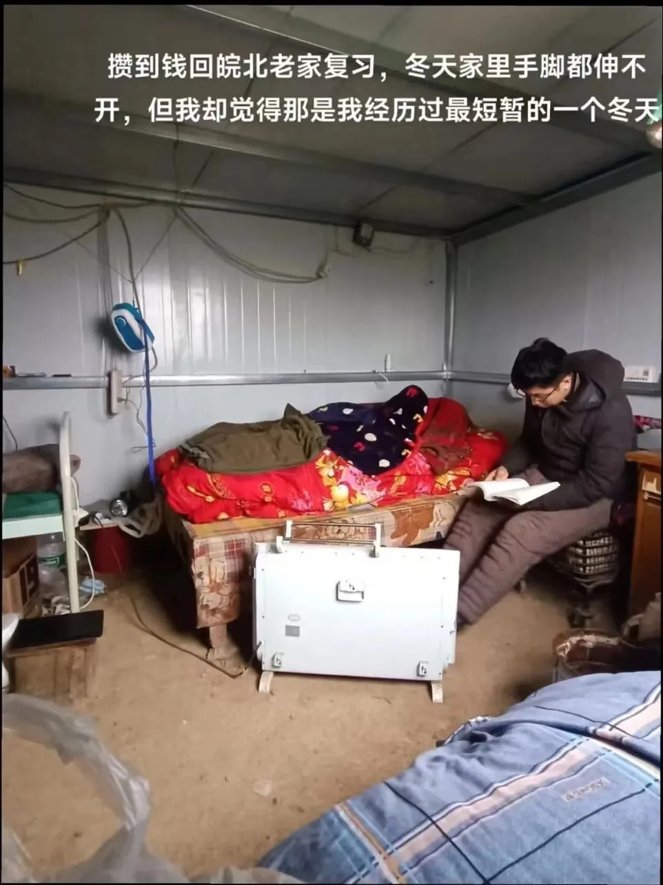 备考的日子浓缩成了社交媒体上的几张照片。在地面没有硬化的房屋中,张舜禹穿着厚厚的棉衣坐在凳子上看书,“攒到钱回到皖北老家复习,冬天家里手脚都伸不开,但我觉得那是我经历过最短暂的一个冬天。”他写道。