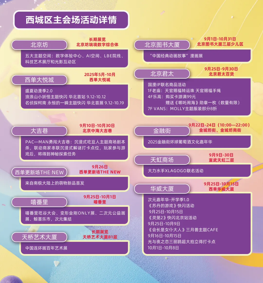西城区联动天桥演艺区、金融街、西单大悦城、北京坊、大吉巷等多个地标,推出产业对接、IP快闪、数字艺术展、沉浸式剧本杀……真正做到 “动画+商圈+文旅+金融”全生态打通!