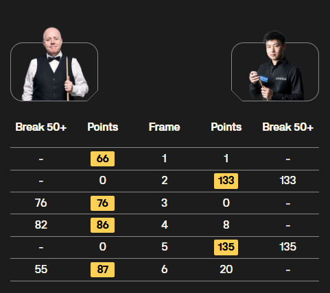 第三局,赵心童在防守中出现漏洞,希金斯拼进远台红球后上手,打出单杆76分制胜,以2比1再度领先。第四局,希金斯凭借精准的防守占据主动。赵心童解球失误被罚分,随后虽有机会上手,但仅得8分便出现简单球失误。希金斯抓住机会,打出单杆82分,将优势扩大为3比1并拿到赛点。