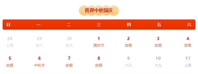 9月28日(星期日)、10月11日(星期六)正常办公。