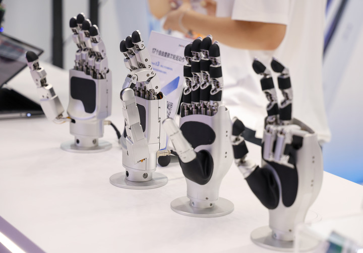 4月24日,首届机器人全产业链接会在深圳会展中心启幕,这是兆威机电展台展出的灵巧手。(毛思倩 摄)