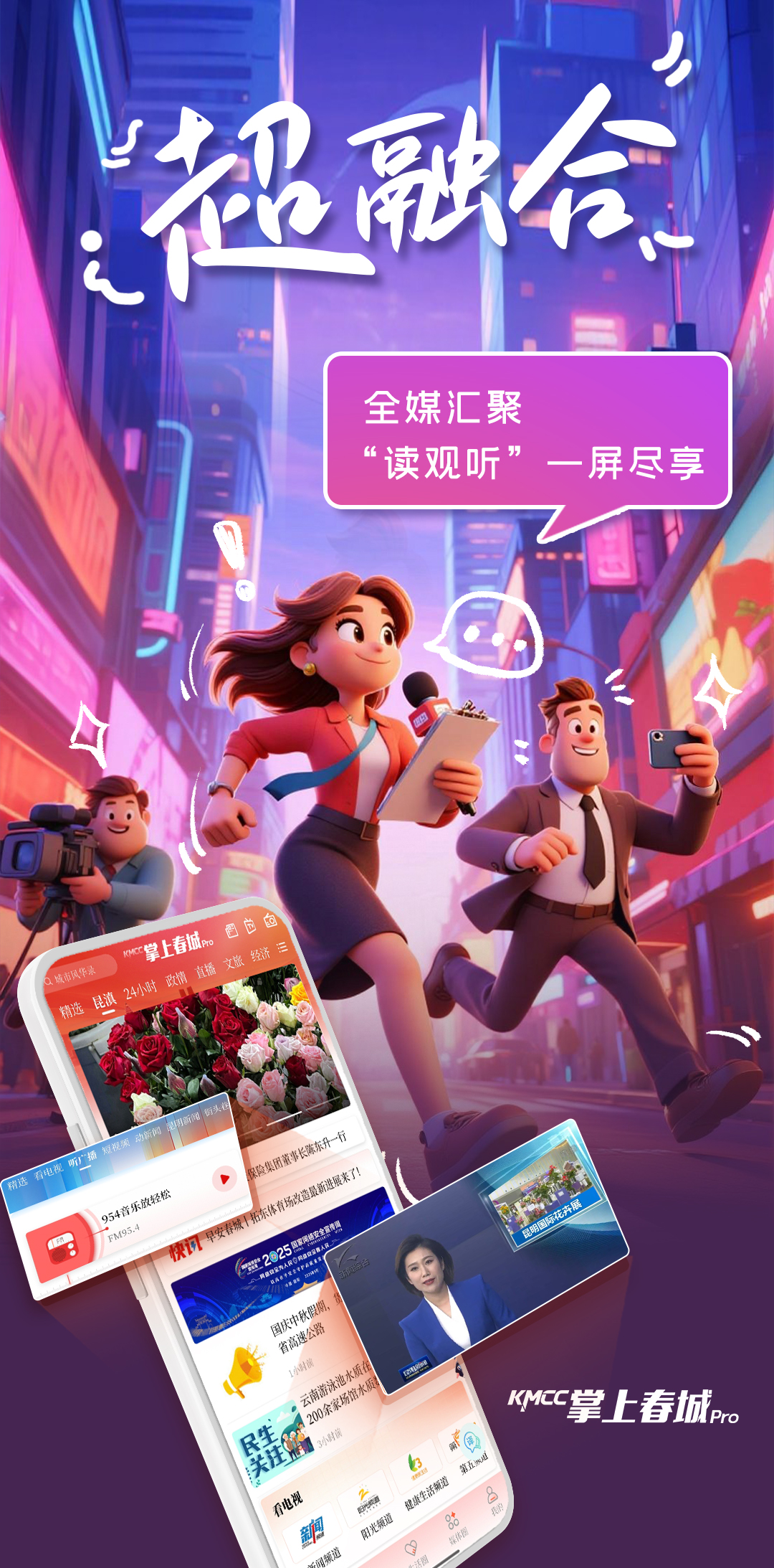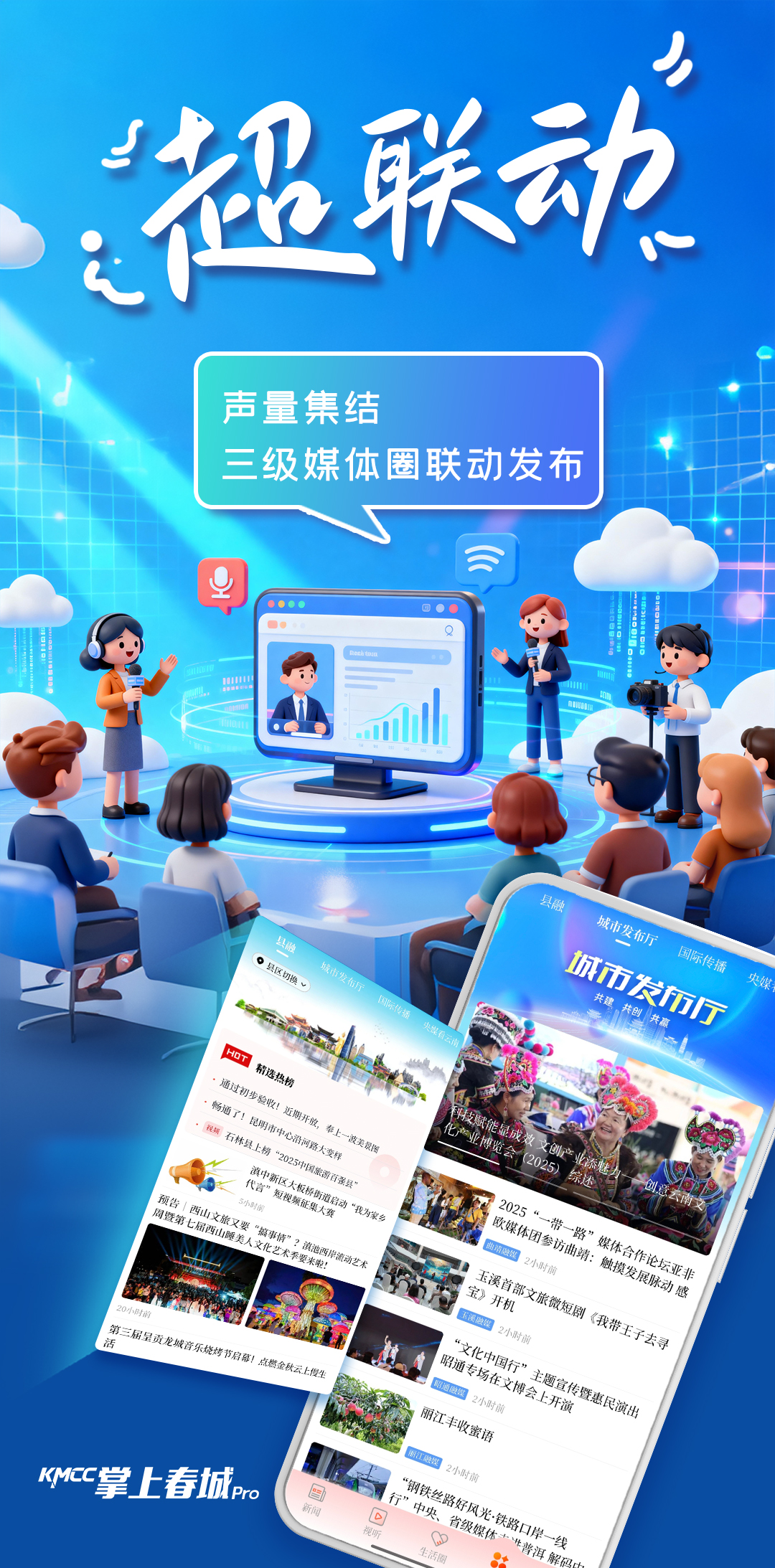 作为全国首批地市级融媒体中心试点城市,昆明市融媒体中心组建两年来,着力推进报业广电媒体优化融合,强化自主可控,突出移动优先,规划建设超级媒体服务平台:整合市级媒体优质品牌节目、栏目、账号;联动州市、县区一体传播;接入国际传播多语种发布平台、实用工具;赋能城市服务、治理、消费。以Pro版本超级客户端升级为引领,以先进技术为支撑,加快推进中心系统性变革。