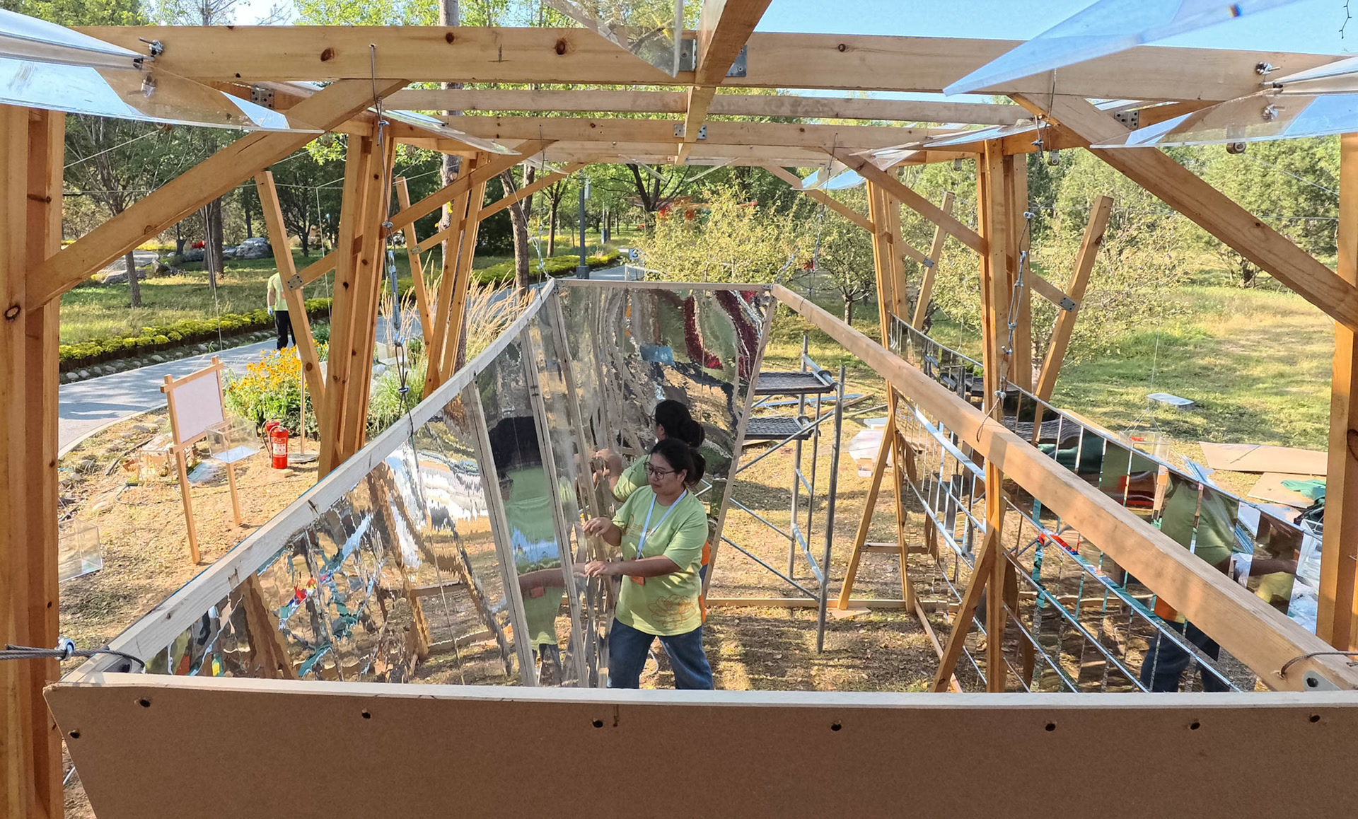 “这个大赛是每个风景园林学生都非常憧憬的,它为我们提供了一个开放的平台,能够将专业学习中的思考与创意真正落地。”来自北京林业大学与新加坡国立大学联合团队的参赛选手马瑞杰介绍,他们的作品《南风知意》以“风”为主题,提取东方折扇的扇骨与扇面形态,将“风”的意象转化为可自由张合的模块化单体,轻盈的构筑散落于林木间,风吹过时每个瞬间作品都可以是不同的。