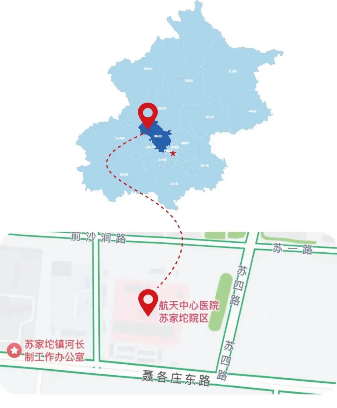 · 公交路线:902路、908路、46路、98路至“航天中心医院苏家坨院区”站下车;447路、专38路至“同泽园东里”站下车,步行5分钟即达。