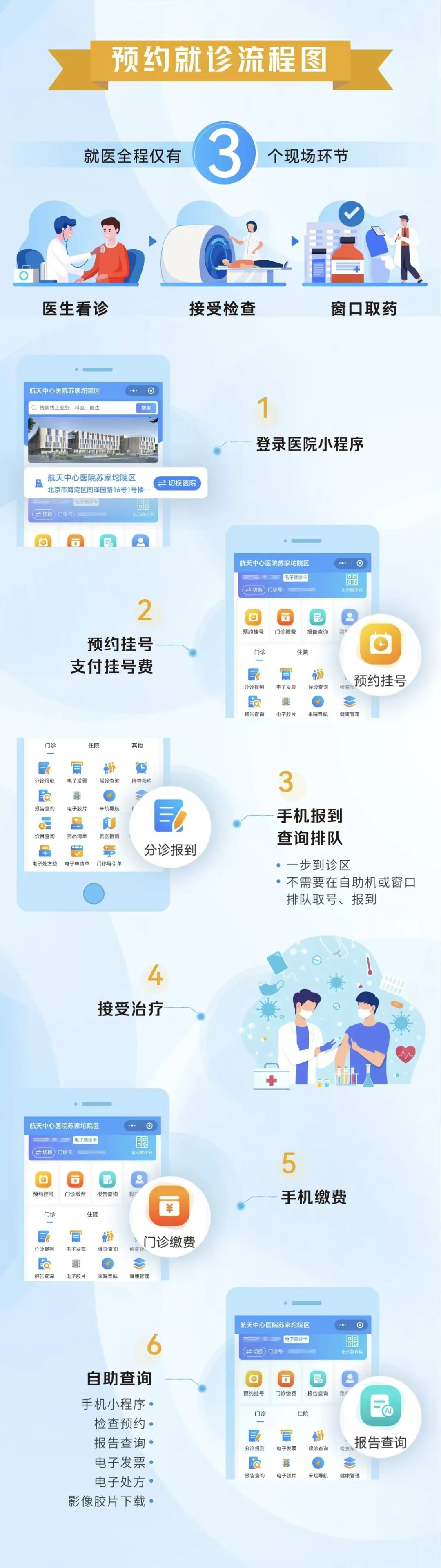 线上通过航天中心医院小程序,线下使用门诊自助机或诊间预约进行挂号。