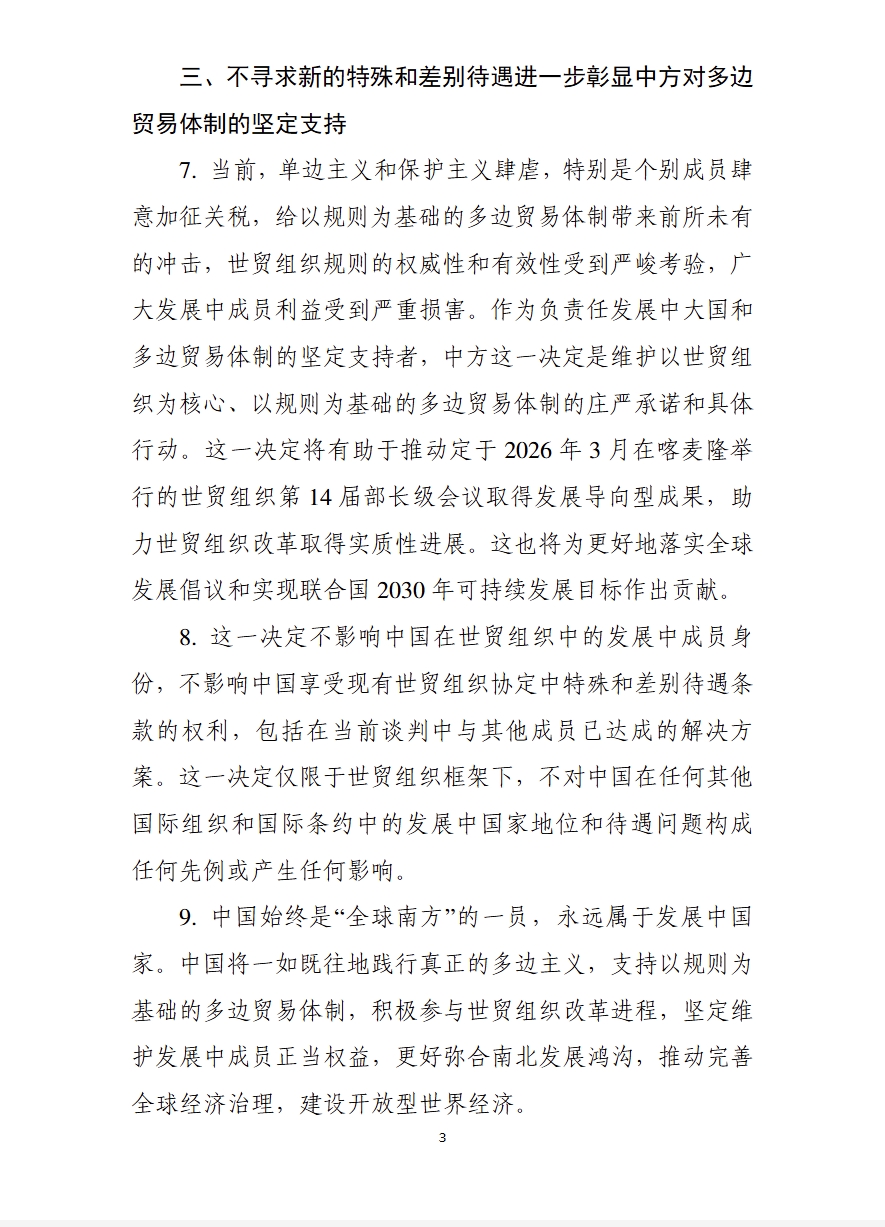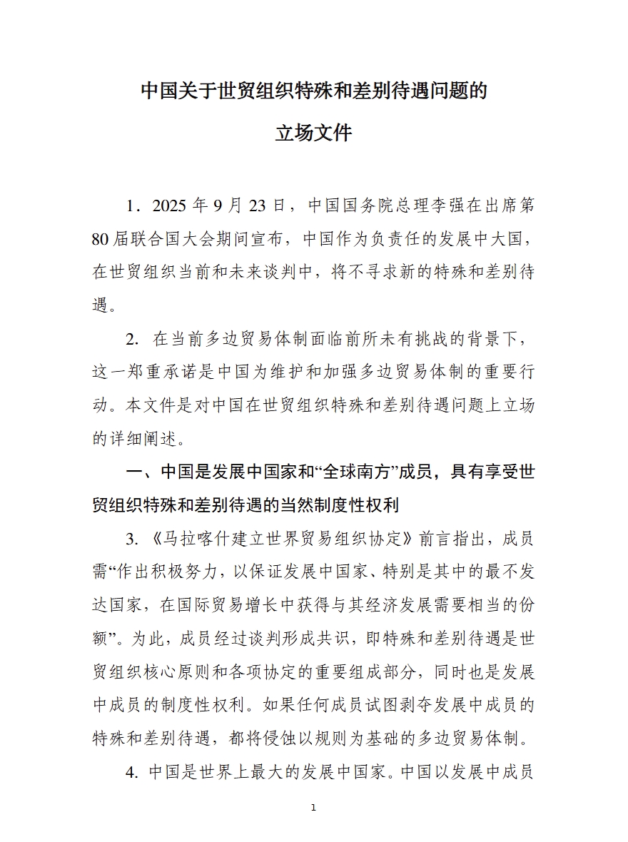 2025年9月24日,中国向世贸组织提交了《中国关于世贸组织特殊和差别待遇问题的立场文件》。