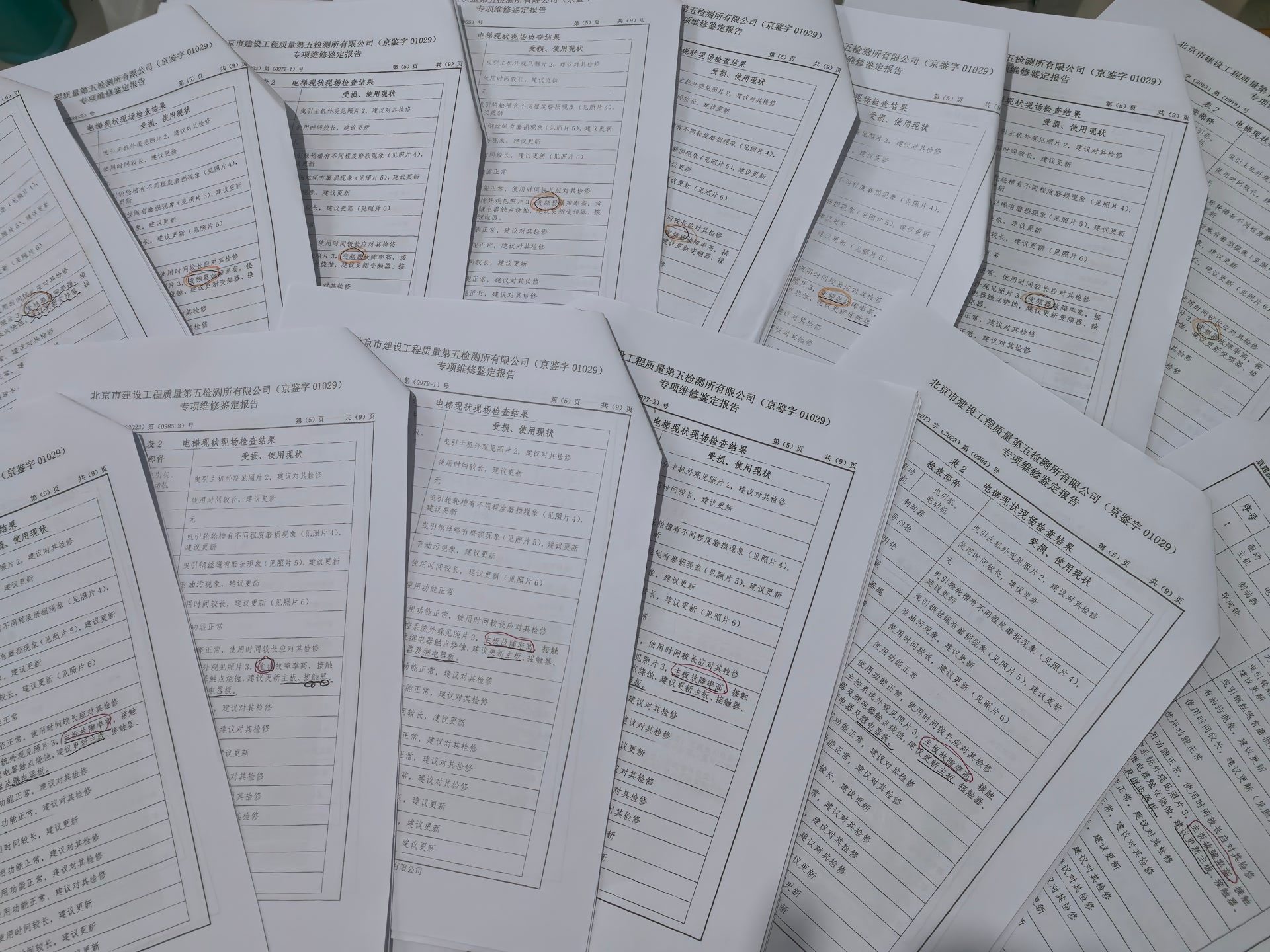 将收集到的25份电梯鉴定报告一一对比,业主发现,这25份报告竟然共用了两个模板:仅在表2第7项“控制柜”中,15份报告写的是“变频器故障率高,建议更换变频器”,另外10份报告写的是“主板故障率高,建议更新主板”,其余20余项大小部件的检查结果均一致。