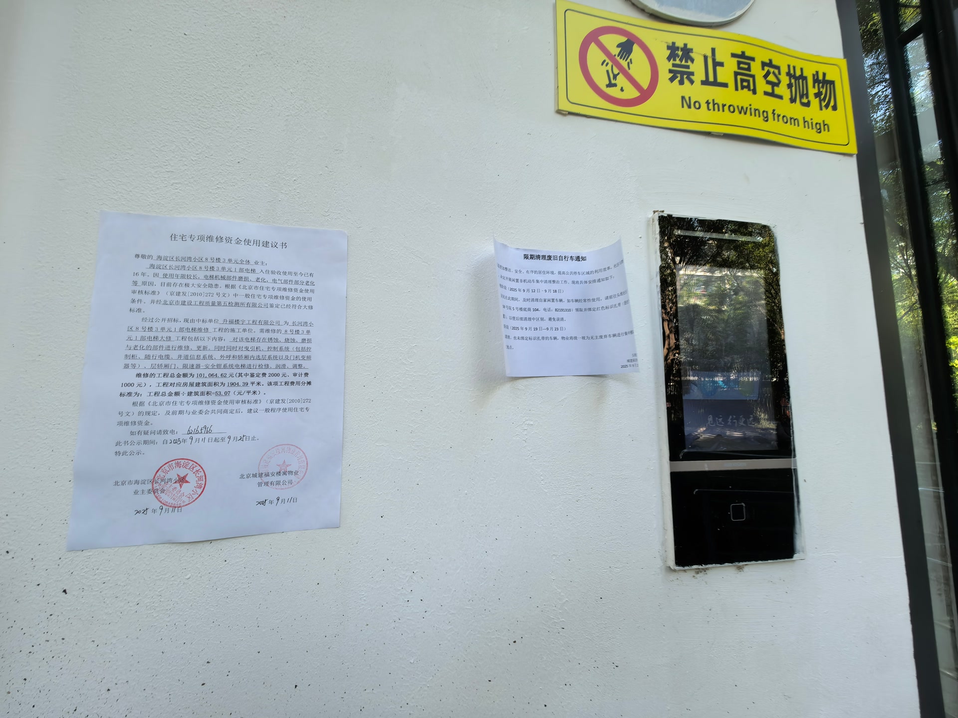 该建议书由长河湾小区业委会与小区物业联合发出,落款时间为2025年9月11日,公示时间为9月11日至25日。建议书旁还张贴着一张通知,称物业公司已聘请北京市建设工程质量第五检测所有限公司对长河湾小区电梯进行了抽查,并出具了电梯鉴定报告,结论为该部电梯已超过保修期,“经评估,该电梯存在安全隐患,建议维修或更新。经过招投标,确定升福楼宇工程有限公司为施工单位”。