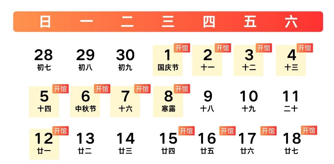 2025年10月1日至10月8日,开放时间由原9:00—17:00调整为9:00—18:00,17:30停止入场。
