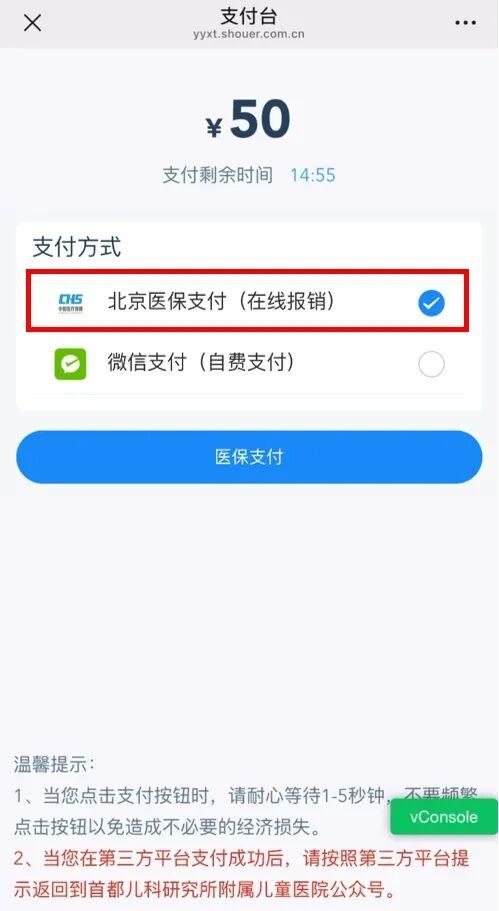 北京医保患儿在线预约挂号,支付医事服务费,可选择“北京医保支付”方式。