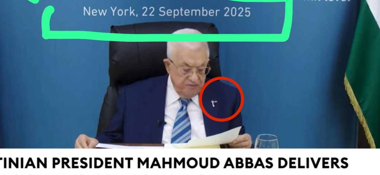 以色列外交部帖文配图显示,阿巴斯22日在联合国会议期间发表视频讲话时佩戴一枚“钥匙徽章”。图源:以色列外交部X账号