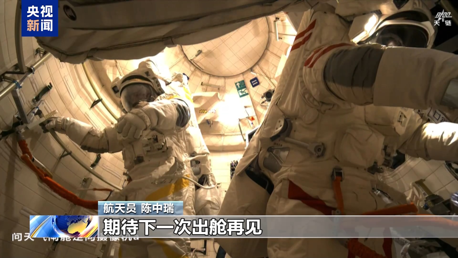 航天员 陈中瑞:这是乘组一心、天地一体、共同努力的结果。这是我们乘组最后一次出舱了,圆满完成了4次出舱任务,感觉还没出够,期待下一次出舱再见。