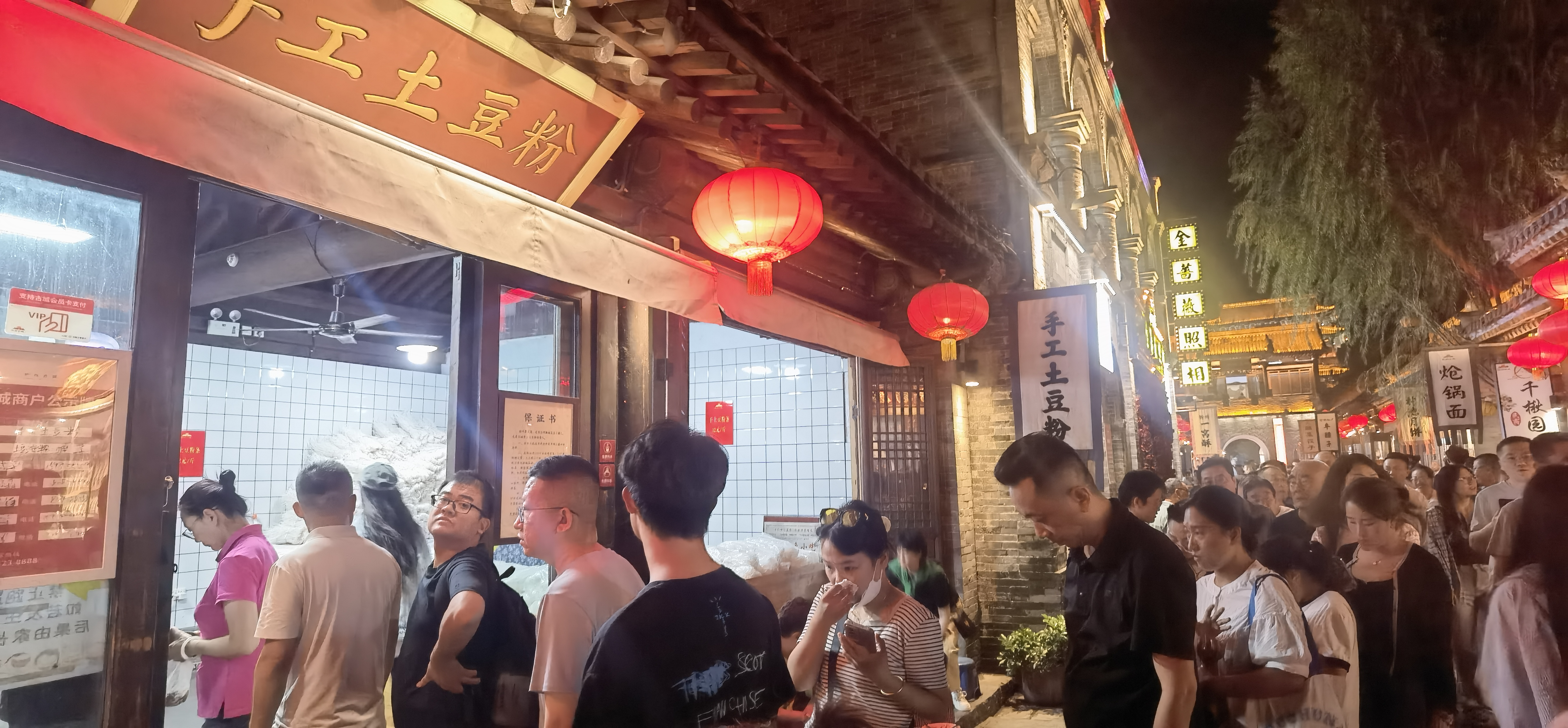 待到夜幕降临,古城才算真正“活”了起来。灯火次第亮起,暖黄的光透过灯笼映在青石板路上,泰山庙巷最是热闹得挤不动人——比肩接踵,人山人海,让我仿佛置身于八九十年代的春节庙会一般。站在巷口,我没有勇气往里走,人实在太多。这烟火气,不是刻意营造的“复古”,而是真正融入生活的鲜活。