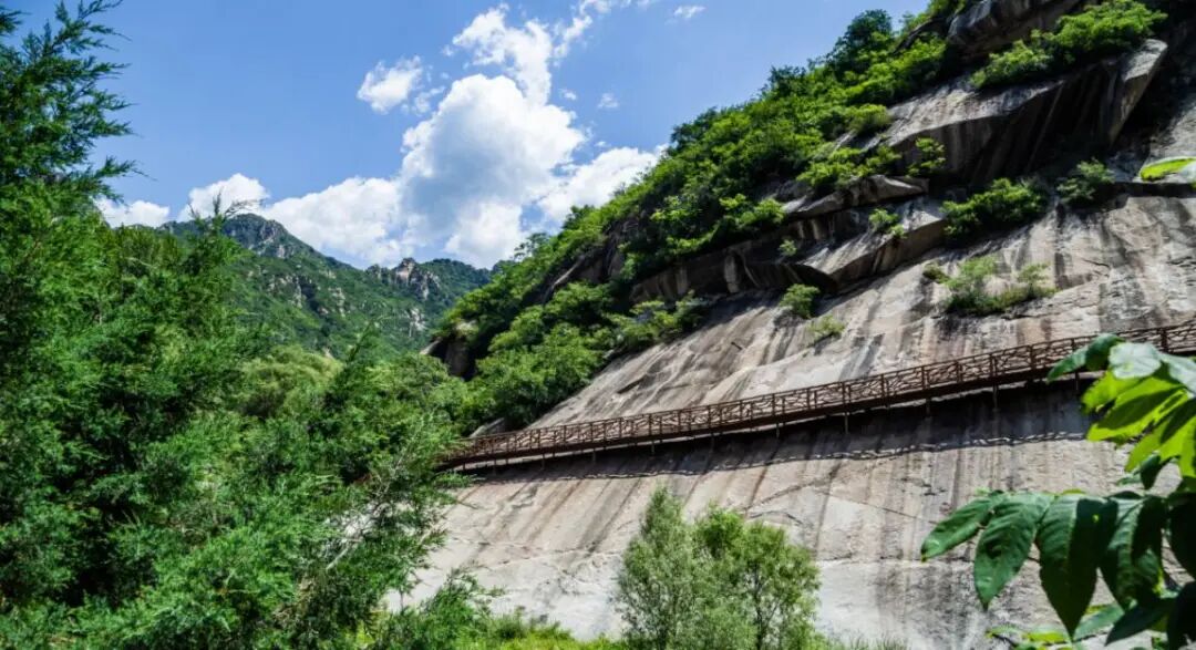神堂峪栈道:7558米木栈道,跨水面,穿山泉,两岸泉水叮咚,潭清林密,远处长城巍峨,处处都是打卡点。