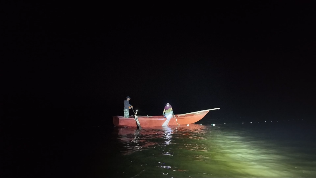 “夜里12点开始下网,今天稍晚了些,一共下了8片。现在刚起了6片,才俩小时,就捕上来100多斤。今天的收获真不错,挺好。”溪翁庄镇白草洼村渔民任继山说道。