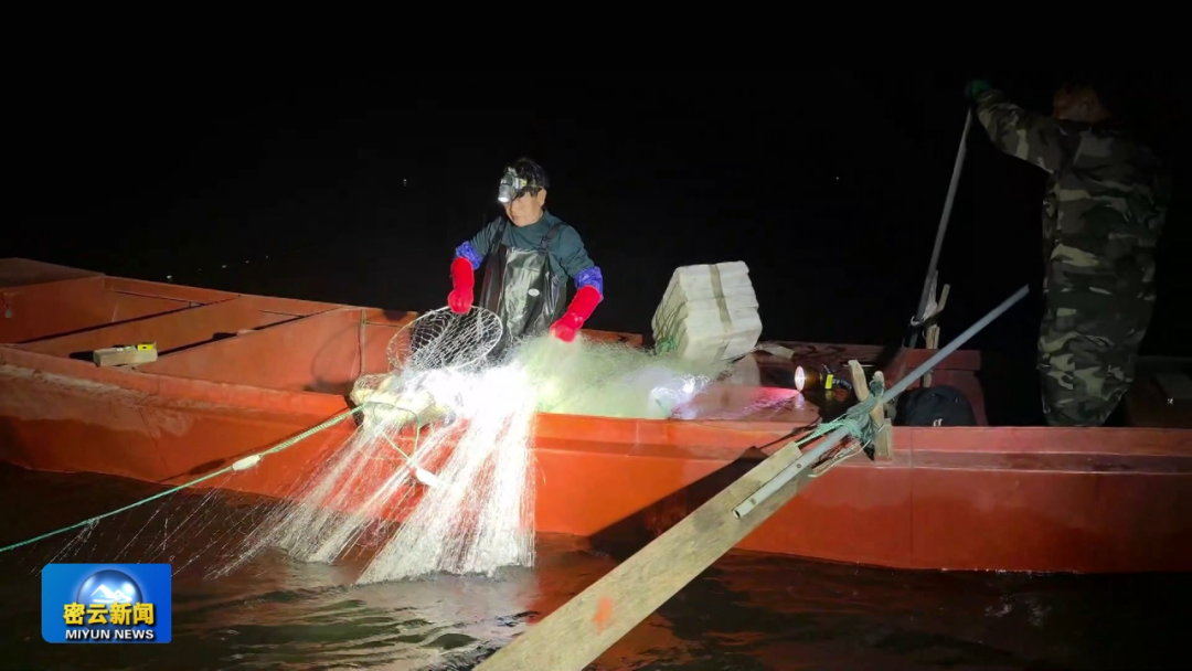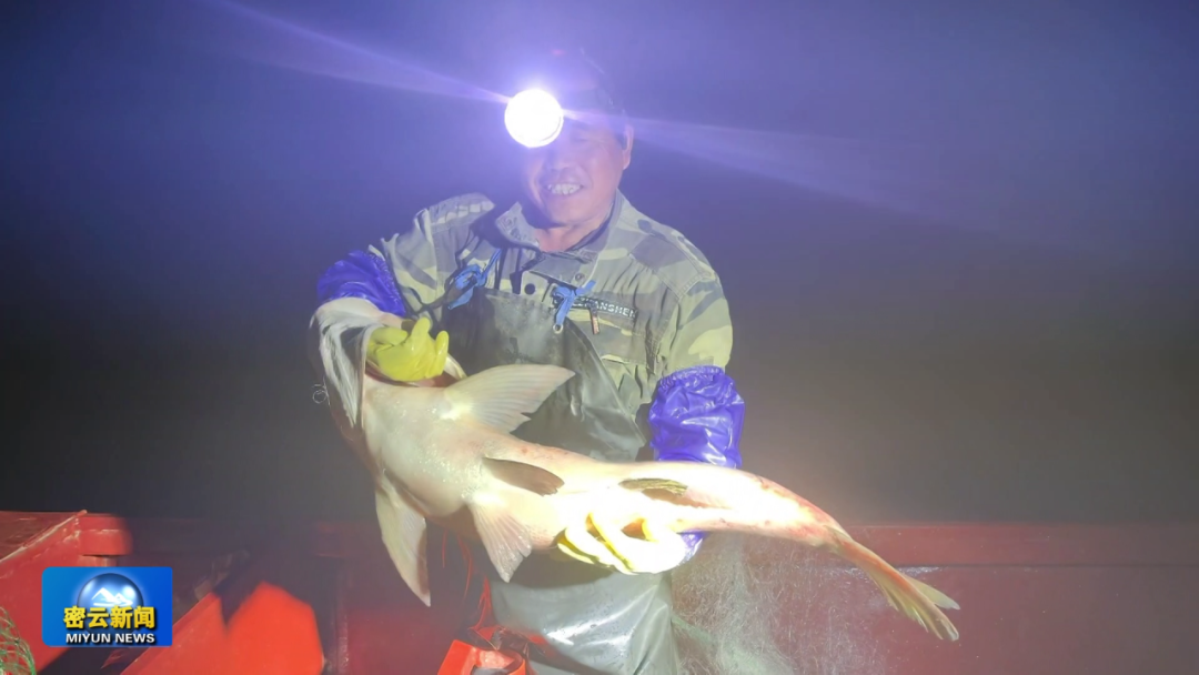 深夜的密云水库,船桨声划破了往日的寂静,一艘艘红色渔船漂浮在水面上,散发着星星点点的渔火,渔民们默契配合,摆正船身、拉起渔网、一条条鲜活的水库鱼跃出水面。