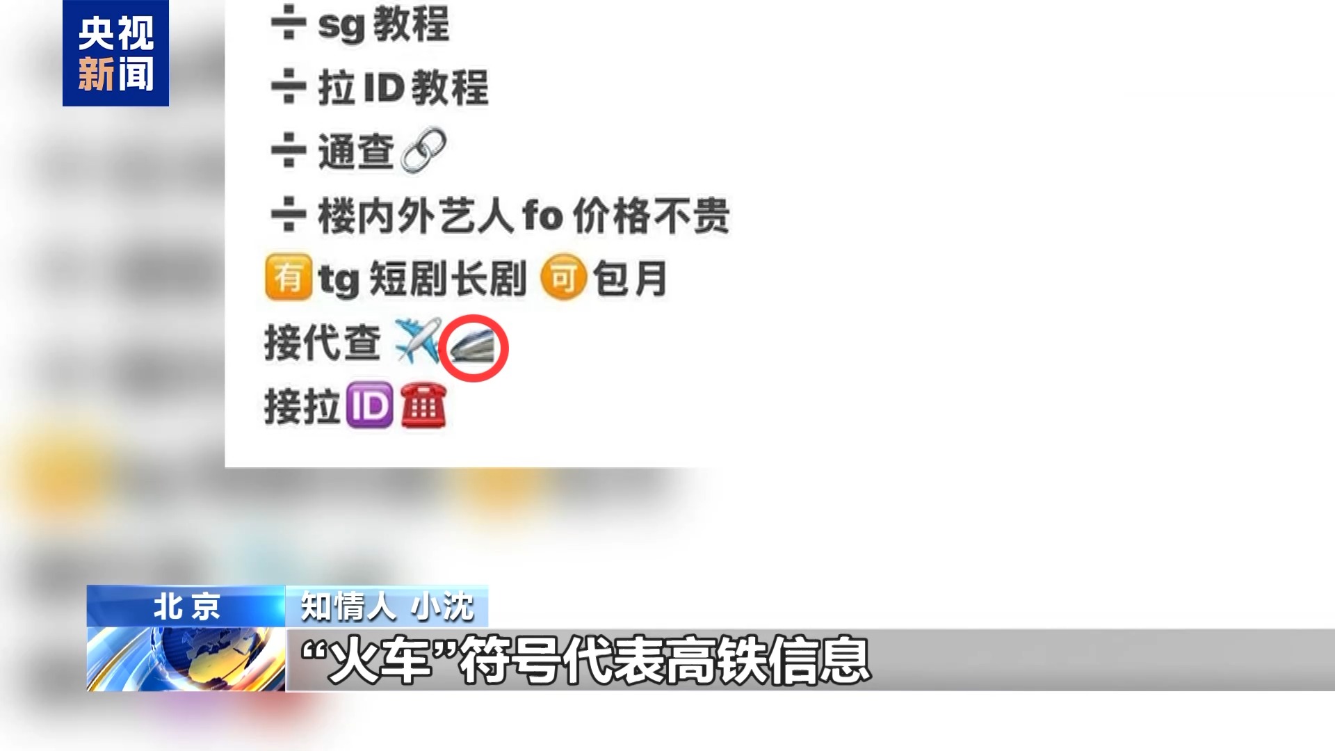 知情人 小沈:黄牛对购买信息的人一般都非常谨慎,通常都是说一些暗语,比如说字母“tg”是“通告”的缩写,字母“sjh”是“手机号”的缩写;“飞机”符号代表航班信息,“火车”符号代表高铁信息,“ID”字符代表身份证号。