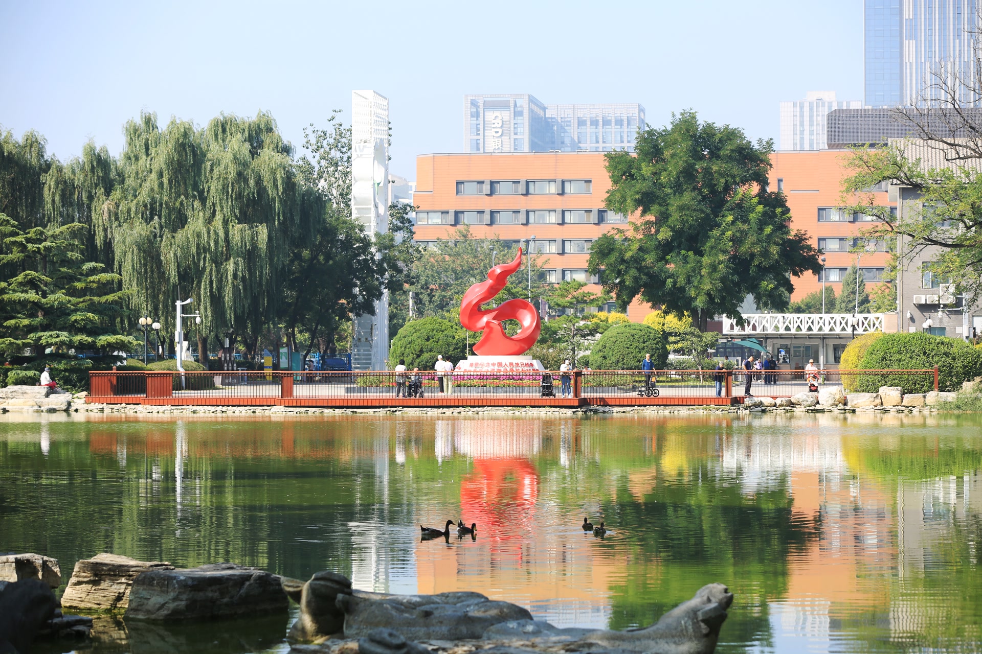 迁址后的雕塑与公园景致形成奇妙共鸣。记者在现场看到,烈焰般的雕塑主体倒映在身后的西湖水面,随波晃动的倒影宛若红旗漫卷,生动诠释着胜利的喜悦。湖面上野鸭群游、水波轻漾,与雕塑的庄严肃穆形成动静相宜的画面,从对岸望去,尽显祥和景致。“一进门就被这雕塑的气势打动了,倒影落在水里特别有感染力。”市民张女士一边拍照一边说,她特意带孩子前来参观,希望让孩子在实景中感受民族精神。