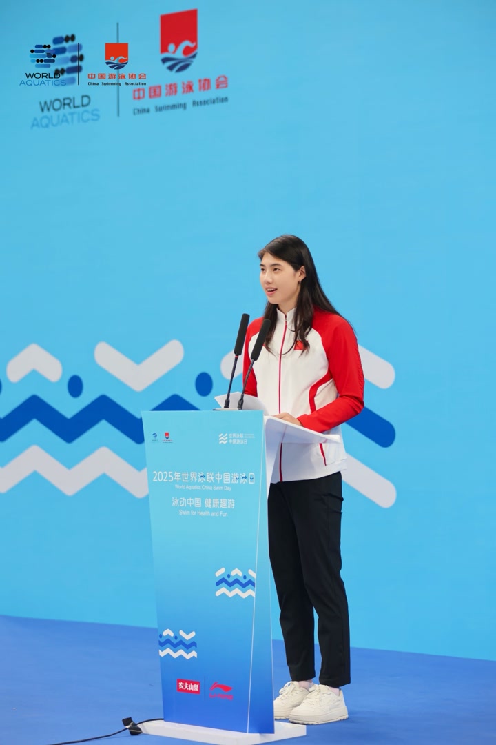 游泳奥运冠军张雨霏在活动现场发出倡议,呼吁大家积极投入泳池,拥抱健康生活;用科学健身知识武装自己,安全畅享水之乐趣;号召大家将这份热情传递,共同营造“爱游泳、享健康”的全民健身新风尚。