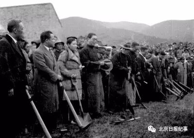 开工典礼上,社会各界代表举行破土动工礼,图为茅以升(前排左八)、罗英(左七)、曾养甫(左四)。