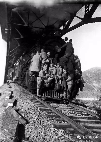 1937年从桥上逃难的老百姓和撤退的士兵。