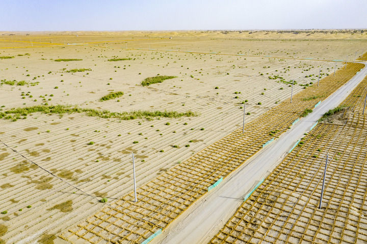 在新疆尉犁县境内的塔里木河南岸防沙治沙区拍摄的罗布麻种植区(左)和固沙草方格(右)(9月20日摄)。新华社记者陈朔摄