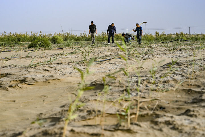 9月20日,新疆尉犁县国有林管理局护林员艾力·尼亚孜(左二)和工作人员一起查看罗布麻长势。新华社记者陈朔摄