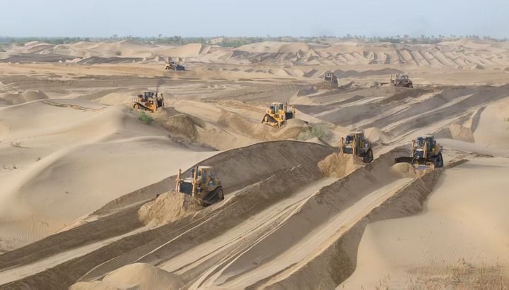 5月22日,在新疆尉犁县境内的塔里木河南岸罗布麻防沙治沙区,大型机械在平整沙丘。新华社发(汪志鹏摄)