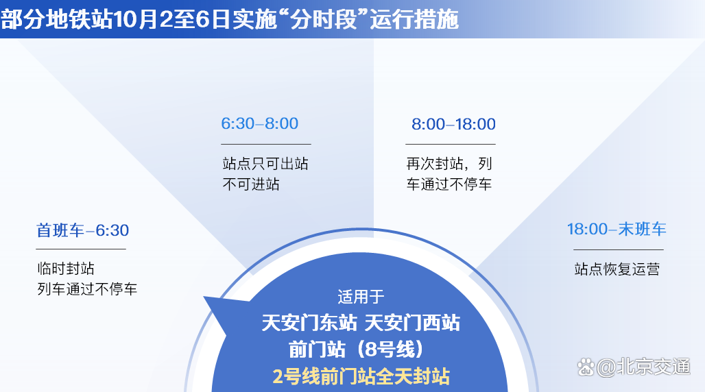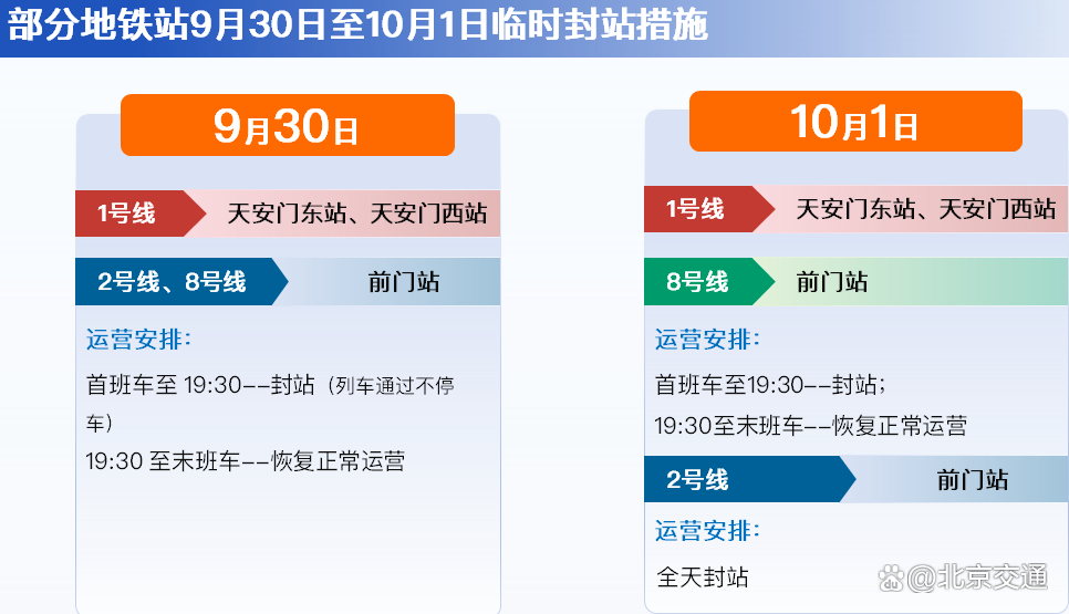 特别提醒的是,今年市交通部门重点对天安门地区地铁车站运营组织模式进行了优化,改进以往全天封站的做法,地铁1号线天安门东站、天安门西站,2号线、8号线前门站,在9月30至10月6日实施“分时段”运营措施,10月7日、8日正常运营。请广大游客提前关注运营调整信息,合理安排出行方式。