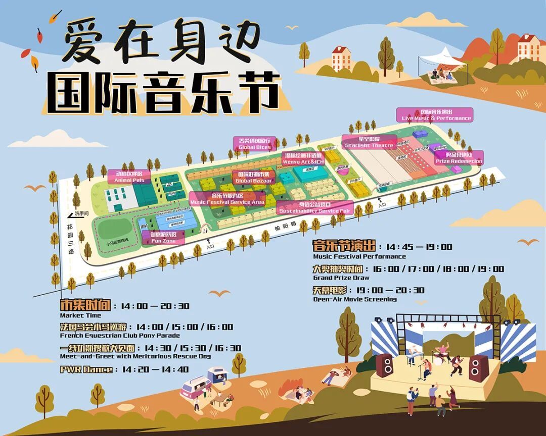 音乐节现场划分主舞台、公益市集区、美食区、儿童游乐区、天幕野餐区五大特色区域。现场将有来自德威、京西、鼎石等国际学校的乐队,以及“土豆王国小乐队”等国民级乐队轮番献艺,带来三个小时不间断演出。