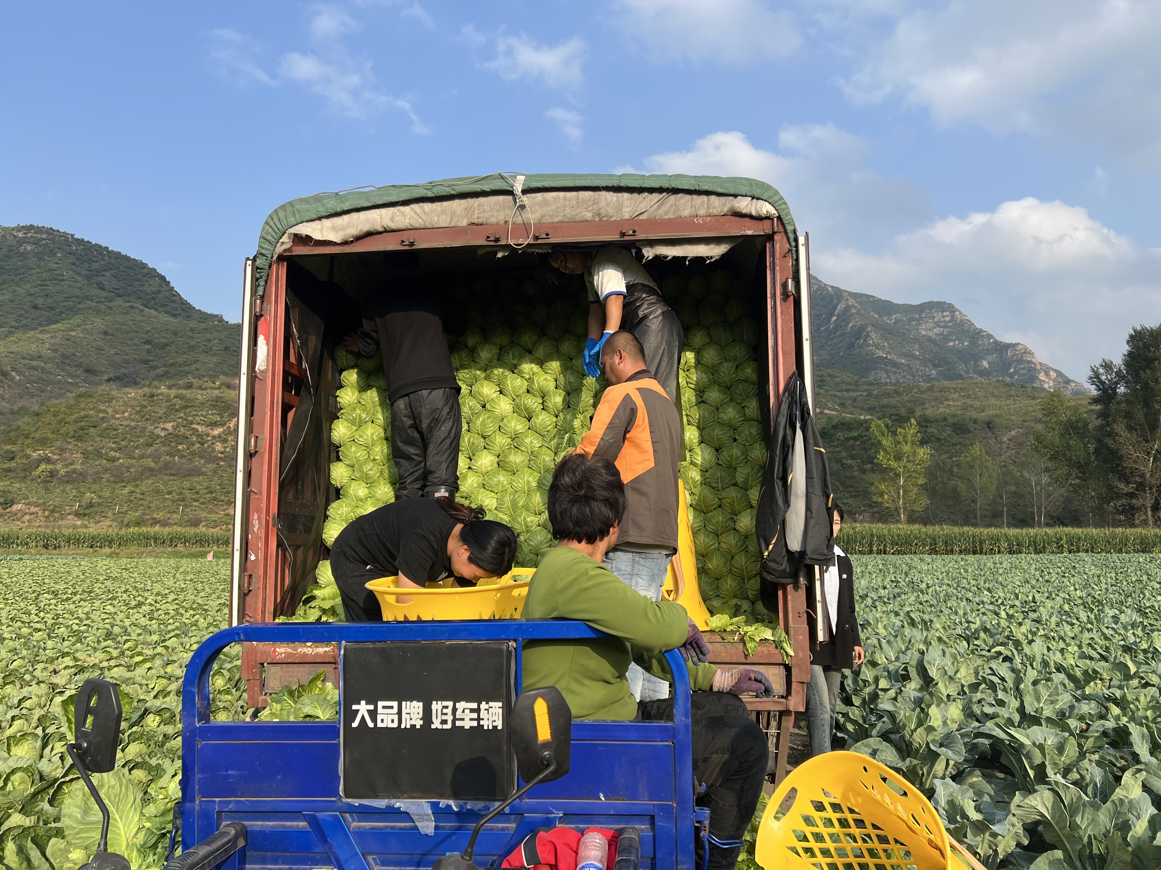 在下马山村遇到66岁村民倪建国时,他正背着筐在绿色无垠的地里忙着收圆白菜。一辆集装箱货车就停在地头,另外几位村民配合着将新鲜的蔬菜整齐地码放在车厢里。此时,倪建国已忙了10个小时,他说现在是收菜旺季,每天从早晨6点开始,一天至少得干12个小时。眼前这批订单是发往山东的,货装满就立即发车。“以前地里种水稻,‘退稻还旱’后种过一阵玉米,咱这儿地肥,村里又尝试着种蔬菜,没想到也能成,现在不少外地人来咱这收菜。”
