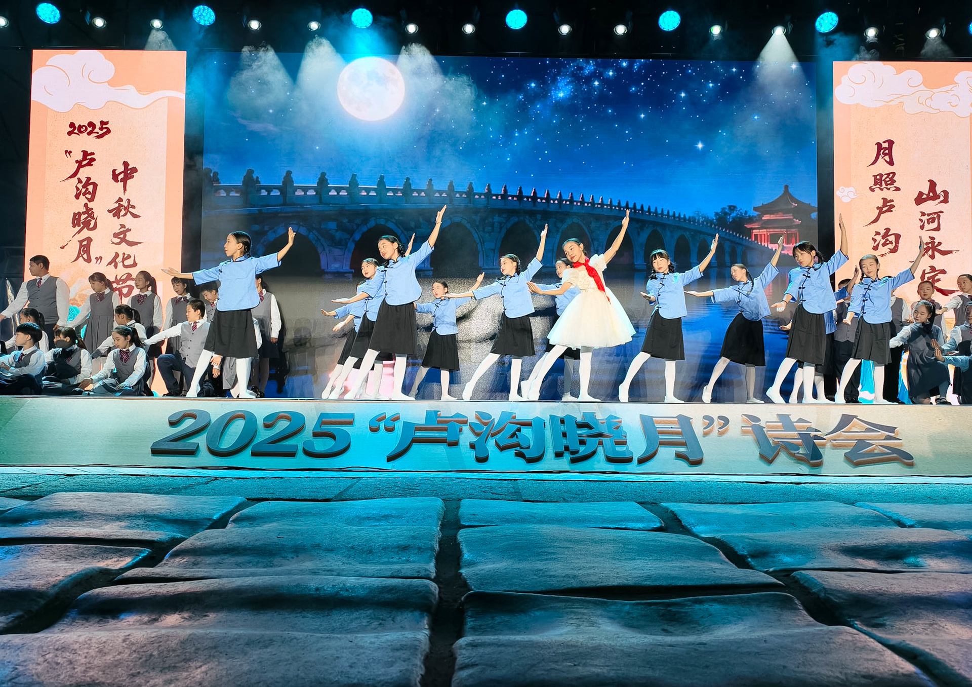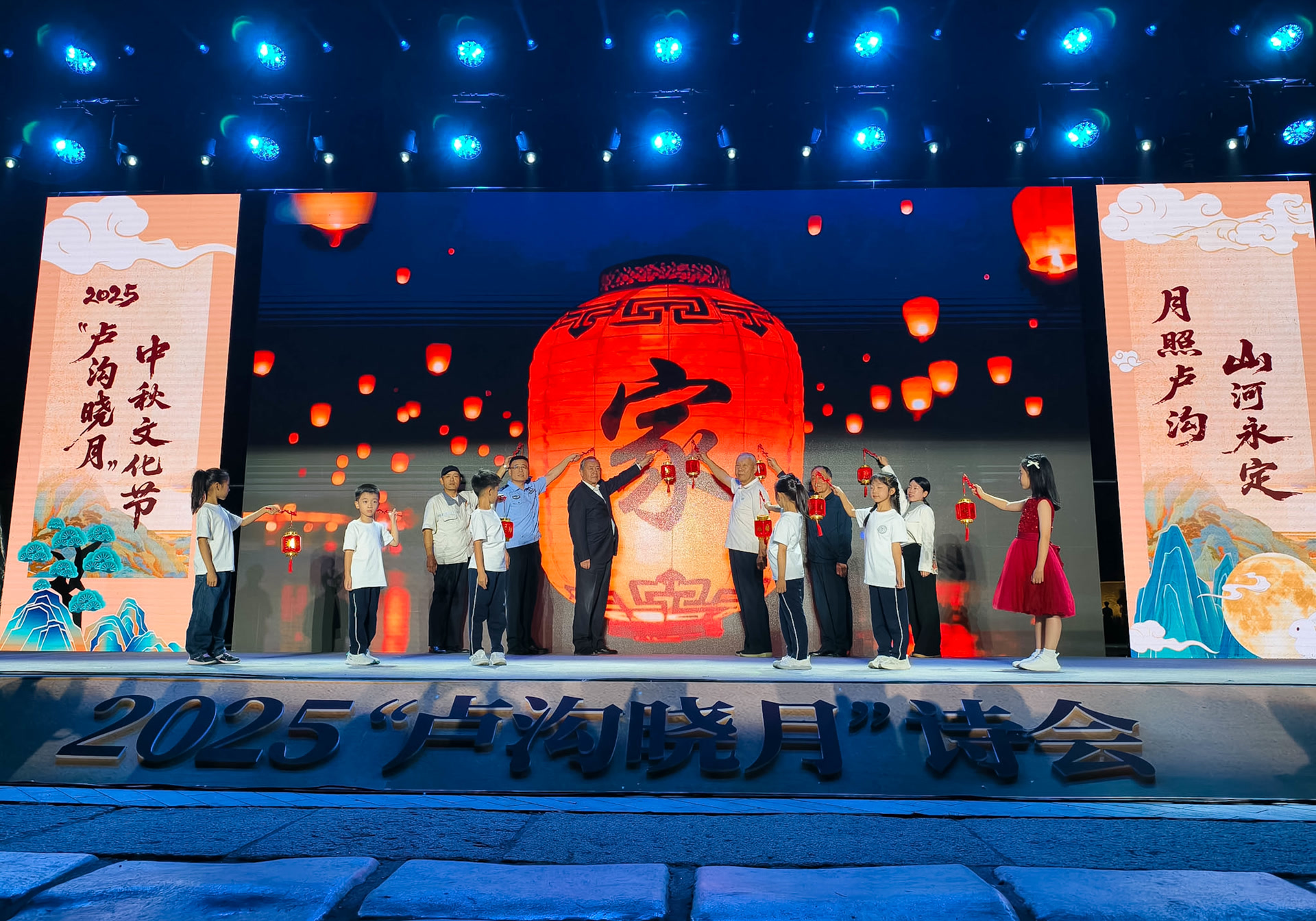 “永定河,出西山,碧水环绕北京湾……”清澈的童声响起,夜幕中的卢沟桥头灯火璀璨,中华经典诵读大会·2025“卢沟晓月”诗会拉开了今年中秋文化节的序幕。伴着永定河的潺潺水声,抗战英雄家书情景剧《山河不会忘记》将现场观众带入剧中情节,开启一场跨越时空的对话,“山河永定”的豪情壮志在此间流淌。佟麟阁将军之孙佟晓东、赵登禹将军之孙赵瑞明等抗战英烈后人与北京榜样、丰台好人、最美家庭代表和学生代表共同点亮“家灯”,让卢沟精神一代代传递。